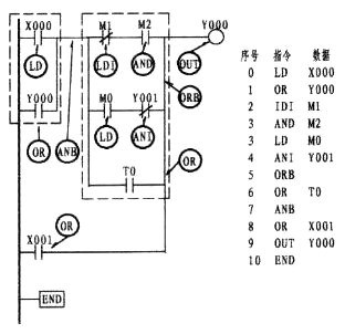 可以看出上圖的X000、X001、M0三者處于并聯關系。由于X000下面二條支路均為單個觸點,因X001是常開觸點,故用OR指令。而M0是常閉觸點,則用ORI指令。三接點并聯后又與M1串聯,串聯后又與Y000并聯,而Y000也是單個觸點,所以仍采用OR指令。可使用OR、ORI指令元件有:輸入繼電器X、輸出繼電器Y、輔助繼電器M、定時器T、計數器C、狀態繼電器S。