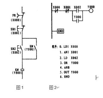 上圖的圖1為電原理圖,圖2則為按與原理圖一一對應的原則編繪的梯形圖,其特點是易于理解,但在我的印象中沒有幾張是可以這樣繪制的。如果采用這樣的方法繪制的話,將有可能走入不歸路。盡管二個圖都可運行,但如果將圖2加以改變而成為圖3 ,可以看出圖3在程序上少了一個步序ANB。簡潔明了是編程的要素。故而在編繪梯形圖時應盡量地將多觸頭并聯觸頭放置在梯形圖的母線一側可減少ANB指令。圖2中的X000、圖3中的X002均為外接熱繼電器所控制的常閉接點,而熱繼電器則用常開接點(或也可將外部的熱繼電器的常閉觸頭與接觸器線圈相串聯)。只有在畫出梯形圖后,再根據梯形圖編出程序。