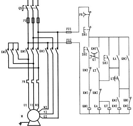 該線路控制的是一臺雙速電動機,一般的人對它不是很理解。電動機型號為YD123M-4/2,6.5/8KW,△/Y。根據型號解讀;該電機具有二種速度即4極和2極,在4極速度下,電動機的功率為6.5KW,繞組為三角形接法。如果在2極的速度下,電動機的功率為8KW,繞組為雙星接法。該電動機共有6接線頭,三角形接時(低速)電源由U1、V1、W1接入,其余接頭U2、V2、W2為懸空。星接時(高速)將接線頭U1、V1、W1接成星點形成了雙星點,三相電源則由U2、V2、W2輸入(電動機接線圖詳上圖所示)。該線路要求;電機可以在低速、高速狀態下擇其一運行。而在高速運行時則按低速啟動再轉為高速運行。自己可根據電原理圖進行分析。