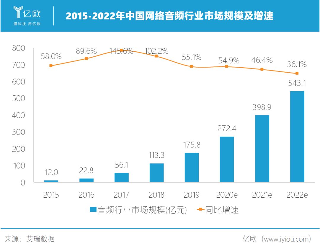 截至2019年,我國網(wǎng)絡(luò)音頻行業(yè)市場(chǎng)規(guī)模為175.8億元,用戶規(guī)模達(dá)4.9億。
