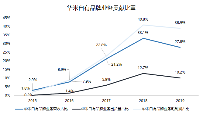 在頂峰的2018年,華米自有品牌以12.7%的出貨量占比貢獻了超過三成營收與四成毛利潤。