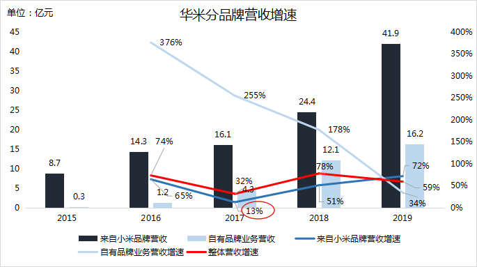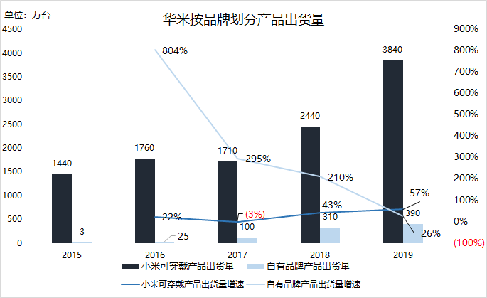 在2019年第一季度財報中,華米曾公布,該季度自有品牌業務營收占比達到41.3%,但從全年占比大幅回落來看,顯然在第二至第四季度,來自小米品牌業務營收占比大幅提升。