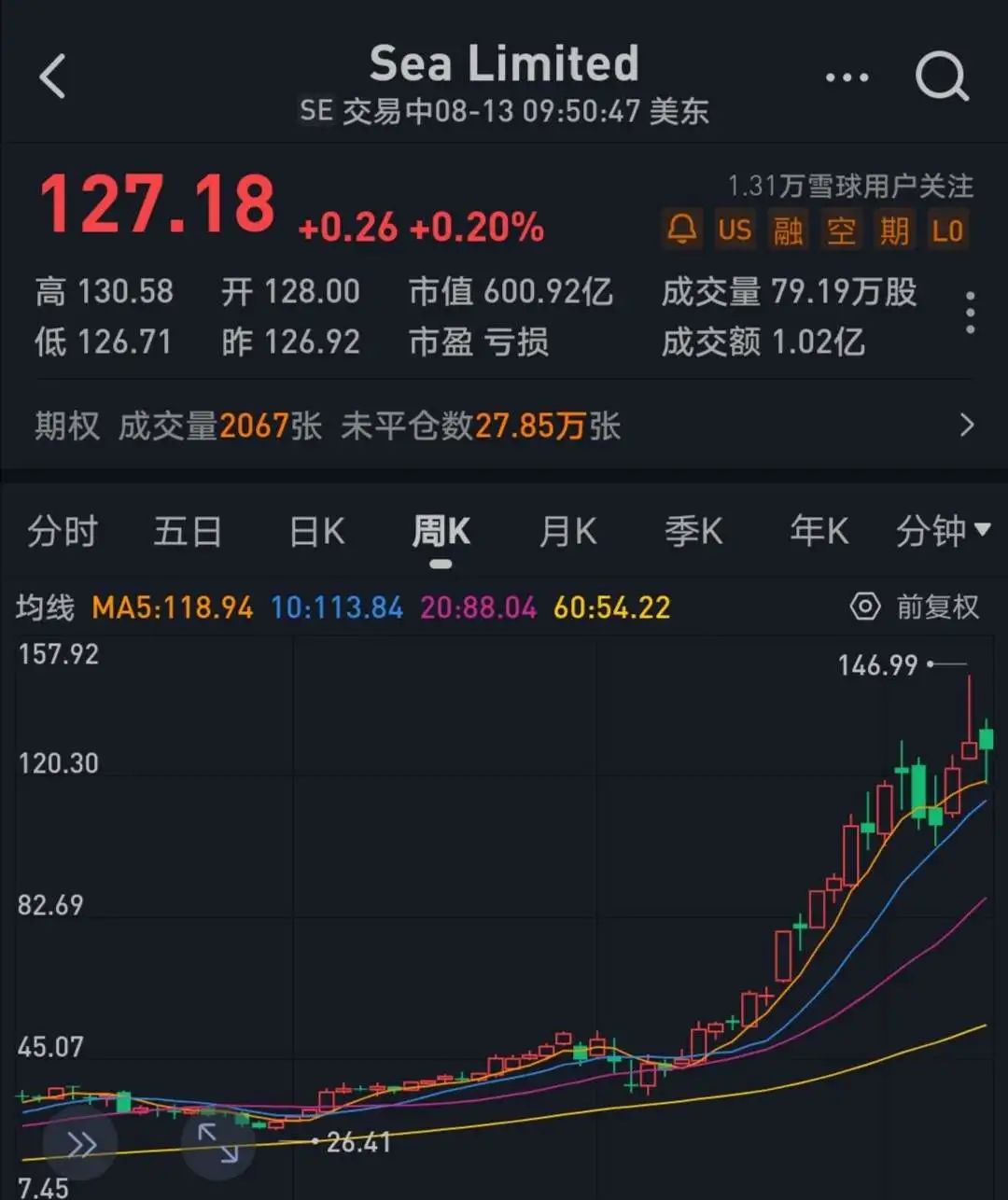 Shopee母公司Sea的股價走勢