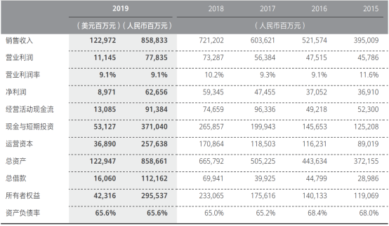 華為2019年年報(bào)披露的5年財(cái)務(wù)概要