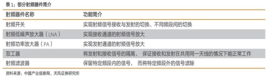 濾波、功放、高精度數(shù)模轉(zhuǎn)換等核心芯片,決定了基站能處理無線信號(hào)的頻段、無線信號(hào)中通信信號(hào)的處理能力和噪聲信號(hào)的抑制能力,基站的負(fù)荷能力等性能。射頻器件的具體功能介紹如下: