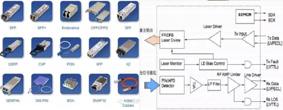 左圖為各類光模塊的不同形態(tài),右圖為光模塊內(nèi)部結(jié)構(gòu)