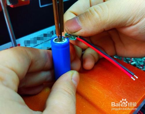 然后以類同方法使用鋰電池點焊機點焊電池負極端,點焊時踩動腳踏開關點焊兩點,如下圖所示。