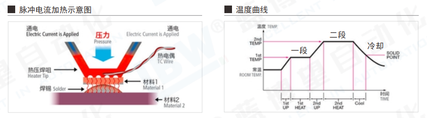 原理:焊接時對焊接部位加壓狀態(tài)下,迅速進行加熱而后快速冷卻,可防止結合部的浮起、虛焊, 對溫度時間等參數(shù)加以高精度地控制,使焊接具有良好的重復性,實現(xiàn)高品質(zhì)的生產(chǎn)。